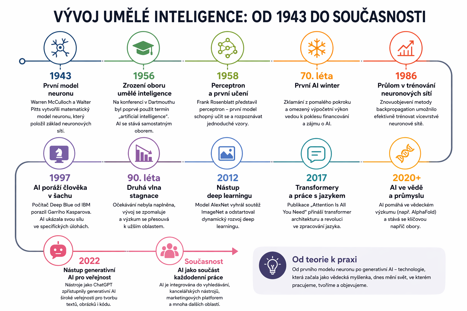 Historie umělé inteligence ukazuje, že technologický vývoj probíhá ve vlnách a je výsledkem dlouhodobého propojení výzkumu, dat a technologického pokroku. Pro firmy z toho vyplývá, že AI představuje dlouhodobý směr, který má smysl využívat především tam, kde dochází ke zpracování velkého množství dat a obsahu. Přínos spočívá ve schopnosti propojit technologii s lidským rozhodováním a strategií. Firmy, které tuto kombinaci zvládnou, získávají konkurenční výhodu v rychlosti, efektivitě i škálovatelnosti.
